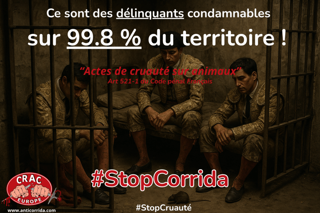 Partout ? Pas tout à fait. Une exception scandaleuse subsiste : dans une cinquantaine de villes seulement — soit moins de 0,2 % du territoire métropolitain — la barbarie de la corrida est encore tolérée au nom d’une “tradition”. Ici, la loi ferme les yeux, et les actes de cruauté sont dispensés par dérogation (un alinéa) de toute sanction pénale.