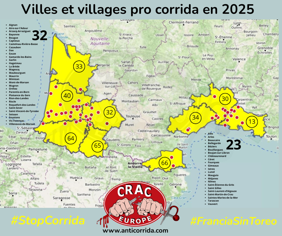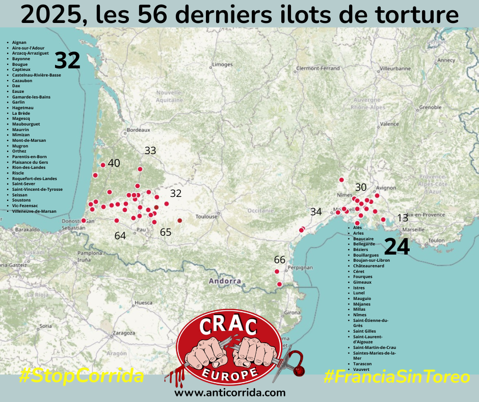 Trois autres départements ne tiennent plus qu’à un fil, avec seulement une ou deux communes pour représenter encore cette soi-disant « culture » de la torture animale.
