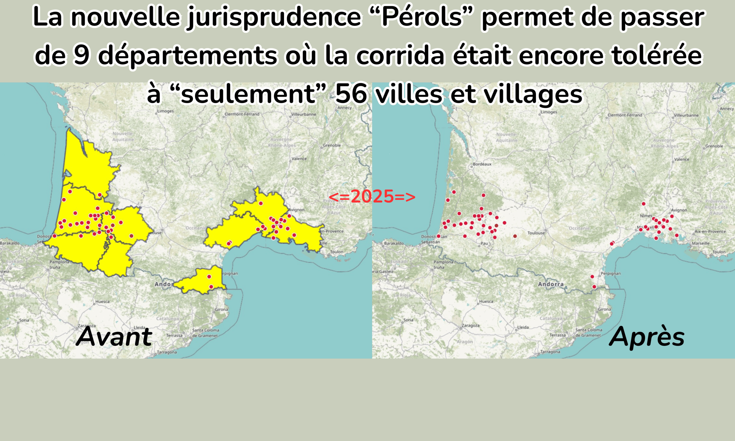 En résumé : avant 1951, la corrida était interdite sur tout le territoire. Depuis 1951, elle n’est interdite que partiellement, avec une tolérance dans une cinquantaine de villes et villages du Sud de la France (53).