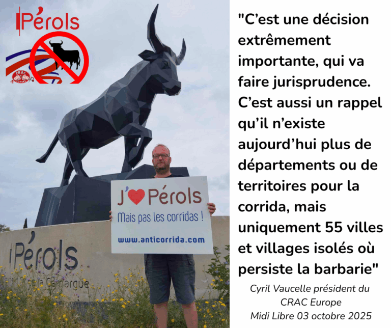 Cette reconnaissance ouvre une nouvelle ère pour notre action. Elle renforce notre capacité à défendre les animaux, à protéger l’enfance et les humains de la violence de ces spectacles, protéger aussi leurs environnements et à porter plus haut encore le combat contre la barbarie tauromachique.